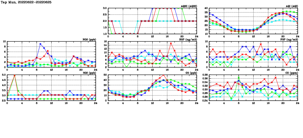 | Air Quality Data Time Series in Tap Mun (2022/06/25) | ( Line colors: Day -3 Day -2 Day -1 Current day ) | 2D Map Current AQHI |