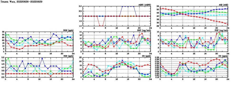 | Air Quality Data Time Series in Tsuen Wan (2022/06/29) | ( Line colors: Day -3 Day -2 Day -1 Current day ) | 2D Map Current AQHI |
