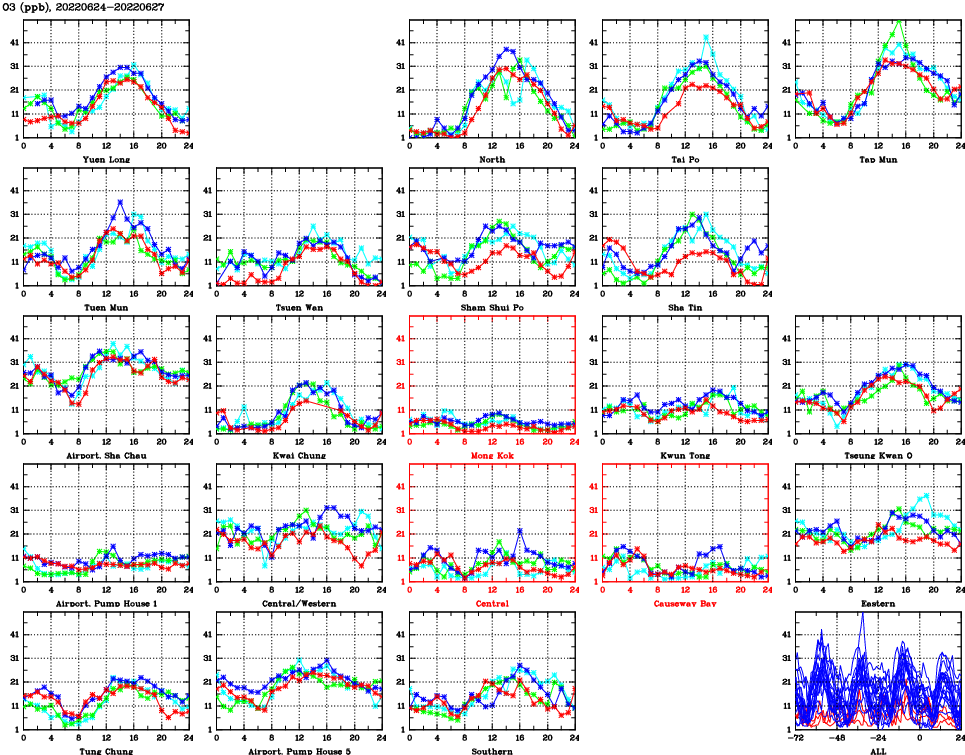| Air Quality Data Time Series for O3 (2022/06/27) | ( Line colors: Day -3 Day -2 Day -1 Current day ) | 2D Map Current AQHI |