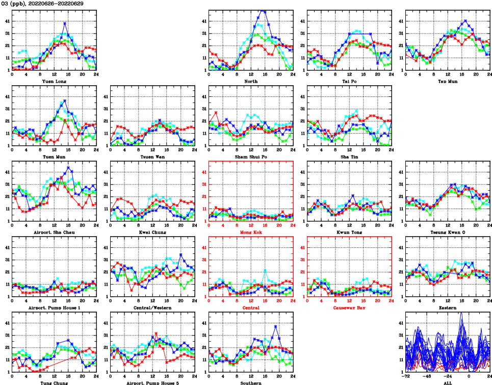 | Air Quality Data Time Series for O3 (2022/06/29) | ( Line colors: Day -3 Day -2 Day -1 Current day ) | 2D Map Current AQHI |