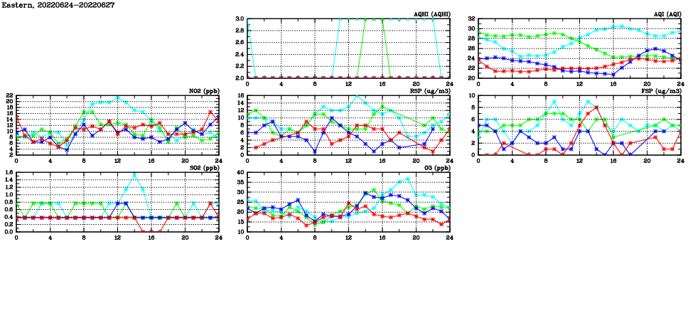 | Air Quality Data Time Series in Eastern (2022/06/27) | ( Line colors: Day -3 Day -2 Day -1 Current day ) | 2D Map Current AQHI |