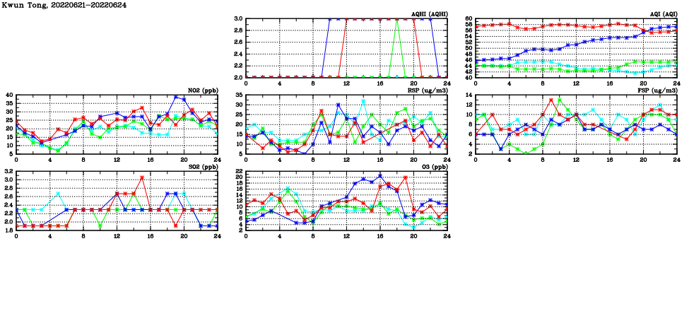 | Air Quality Data Time Series in Kwun Tong (2022/06/24) | ( Line colors: Day -3 Day -2 Day -1 Current day ) | 2D Map Current AQHI |