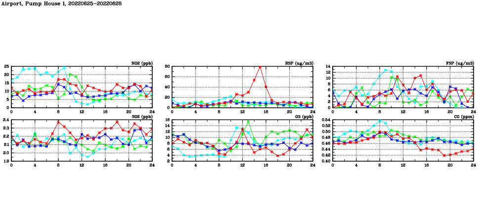 | Air Quality Data Time Series in Airport, Pump House 1 (2022/06/28) | ( Line colors: Day -3 Day -2 Day -1 Current day ) | 2D Map Current AQHI |