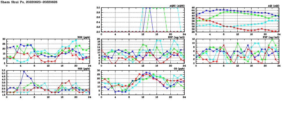 | Air Quality Data Time Series in Sham Shui Po (2022/06/26) | ( Line colors: Day -3 Day -2 Day -1 Current day ) | 2D Map Current AQHI |
