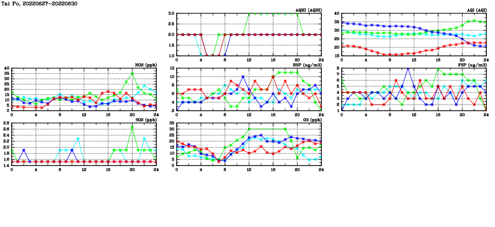 | Air Quality Data Time Series in Tai Po (2022/06/30) | ( Line colors: Day -3 Day -2 Day -1 Current day ) | 2D Map Current AQHI |