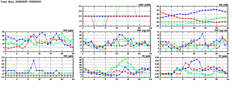 | Air Quality Data Time Series in Tuen Mun (2022/06/30) | ( Line colors: Day -3 Day -2 Day -1 Current day ) | 2D Map Current AQHI |