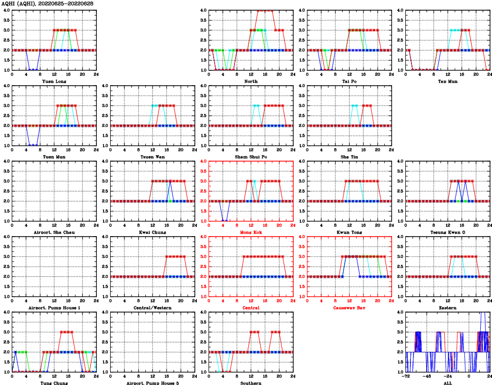 | Air Quality Data Time Series for AQHI (2022/06/28) | ( Line colors: Day -3 Day -2 Day -1 Current day ) | 2D Map Current AQHI |