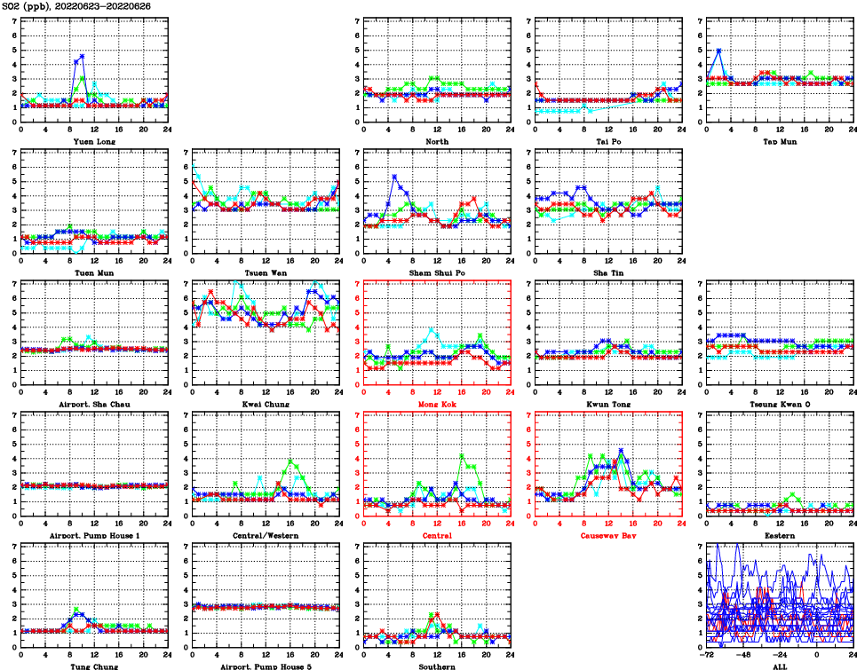 | Air Quality Data Time Series for SO2 (2022/06/26) | ( Line colors: Day -3 Day -2 Day -1 Current day ) | 2D Map Current AQHI |