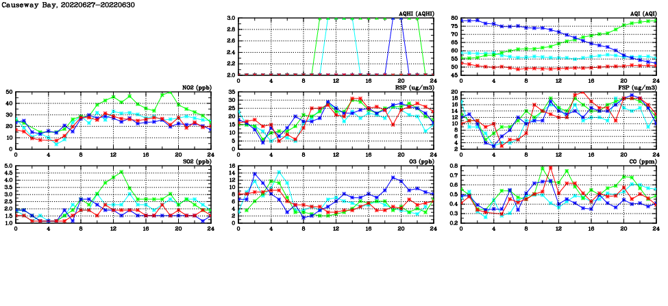 | Air Quality Data Time Series in Causeway Bay (2022/06/30) | ( Line colors: Day -3 Day -2 Day -1 Current day ) | 2D Map Current AQHI |