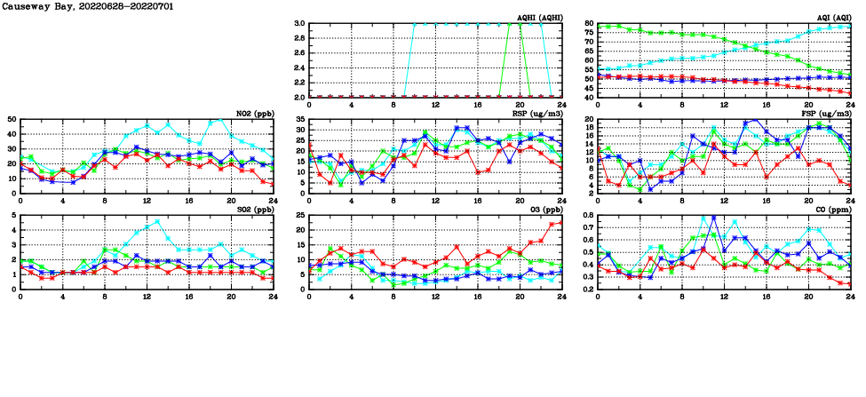 | Air Quality Data Time Series in Causeway Bay (2022/07/01) | ( Line colors: Day -3 Day -2 Day -1 Current day ) | 2D Map Current AQHI |