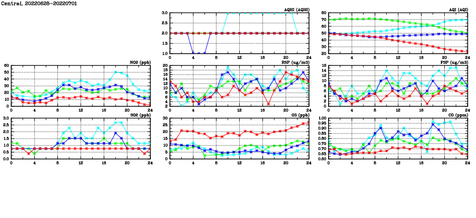 | Air Quality Data Time Series in Central (2022/07/01) | ( Line colors: Day -3 Day -2 Day -1 Current day ) | 2D Map Current AQHI |