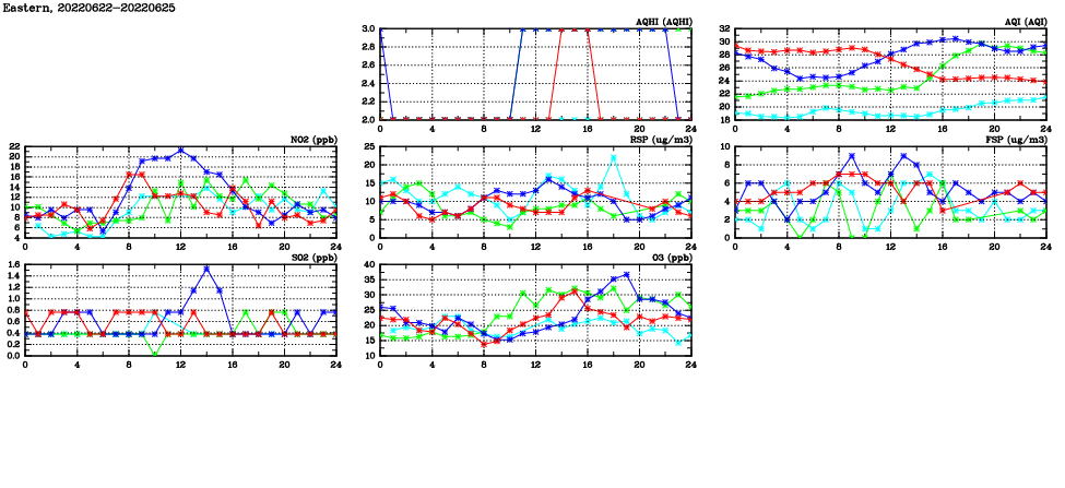 | Air Quality Data Time Series in Eastern (2022/06/25) | ( Line colors: Day -3 Day -2 Day -1 Current day ) | 2D Map Current AQHI |