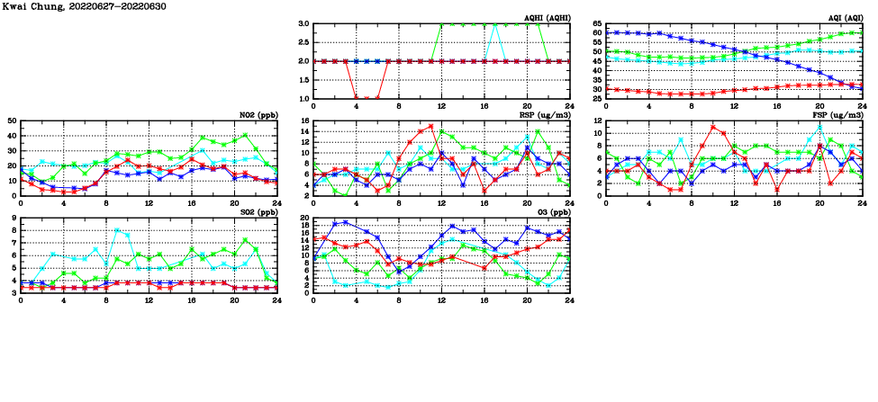 | Air Quality Data Time Series in Kwai Chung (2022/06/30) | ( Line colors: Day -3 Day -2 Day -1 Current day ) | 2D Map Current AQHI |