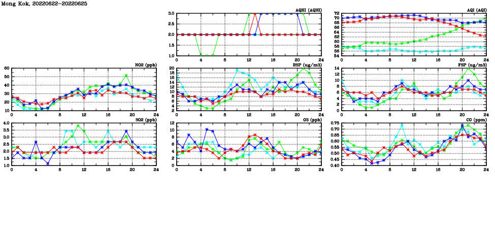 | Air Quality Data Time Series in Mong Kok (2022/06/25) | ( Line colors: Day -3 Day -2 Day -1 Current day ) | 2D Map Current AQHI |