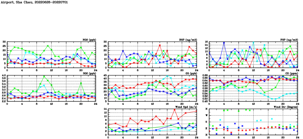 | Air Quality Data Time Series in Airport, Sha Chau (2022/07/01) | ( Line colors: Day -3 Day -2 Day -1 Current day ) | 2D Map Current AQHI |