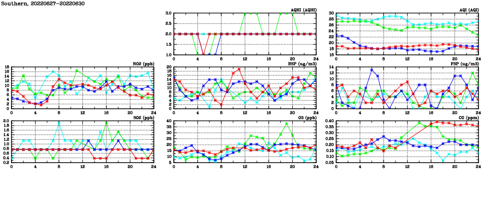 | Air Quality Data Time Series in Southern (2022/06/30) | ( Line colors: Day -3 Day -2 Day -1 Current day ) | 2D Map Current AQHI |