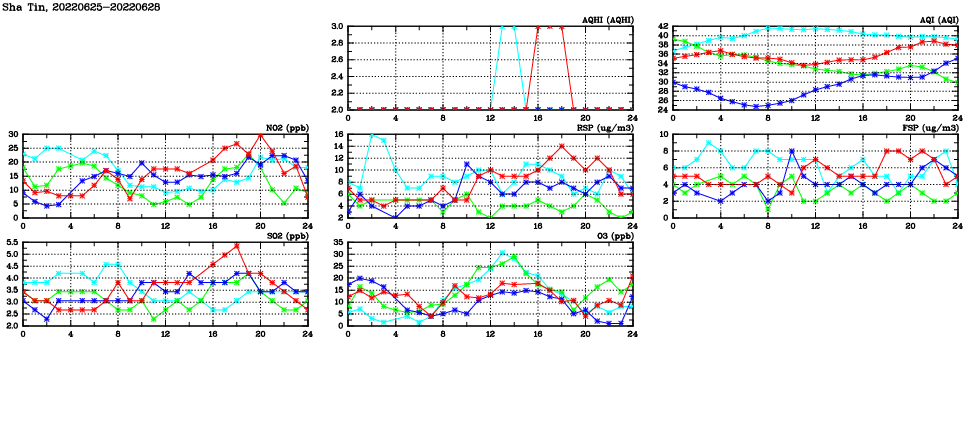 | Air Quality Data Time Series in Sha Tin (2022/06/28) | ( Line colors: Day -3 Day -2 Day -1 Current day ) | 2D Map Current AQHI |