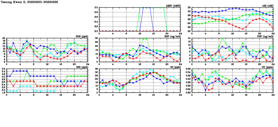 | Air Quality Data Time Series in Tseung Kwan O (2022/06/26) | ( Line colors: Day -3 Day -2 Day -1 Current day ) | 2D Map Current AQHI |