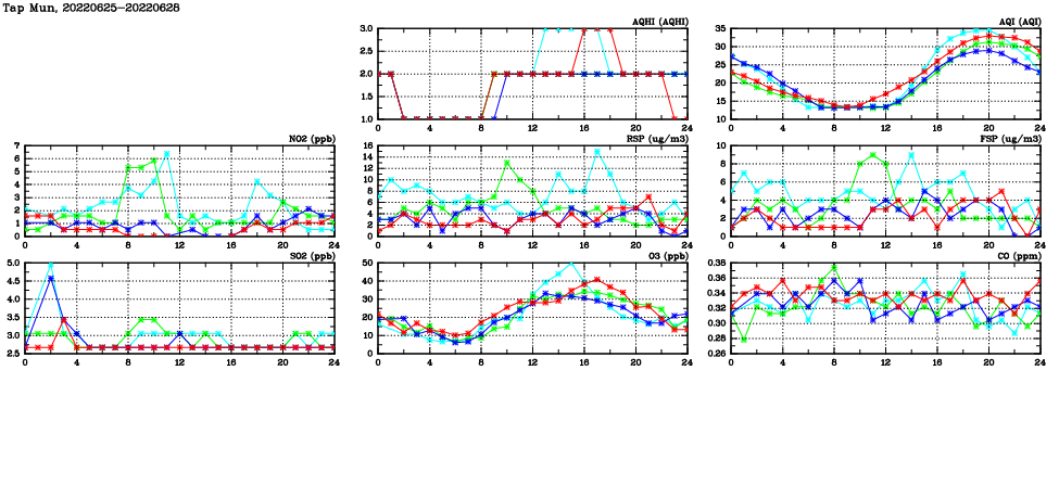 | Air Quality Data Time Series in Tap Mun (2022/06/28) | ( Line colors: Day -3 Day -2 Day -1 Current day ) | 2D Map Current AQHI |