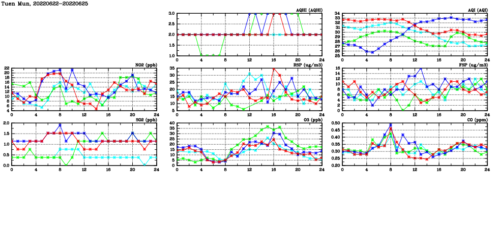 | Air Quality Data Time Series in Tuen Mun (2022/06/25) | ( Line colors: Day -3 Day -2 Day -1 Current day ) | 2D Map Current AQHI |