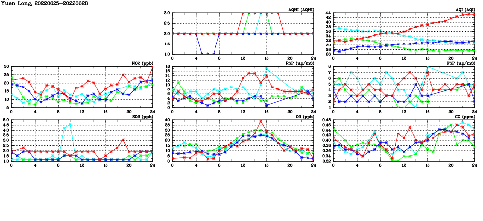 | Air Quality Data Time Series in Yuen Long (2022/06/28) | ( Line colors: Day -3 Day -2 Day -1 Current day ) | 2D Map Current AQHI |