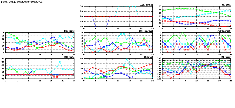 | Air Quality Data Time Series in Yuen Long (2022/07/01) | ( Line colors: Day -3 Day -2 Day -1 Current day ) | 2D Map Current AQHI |