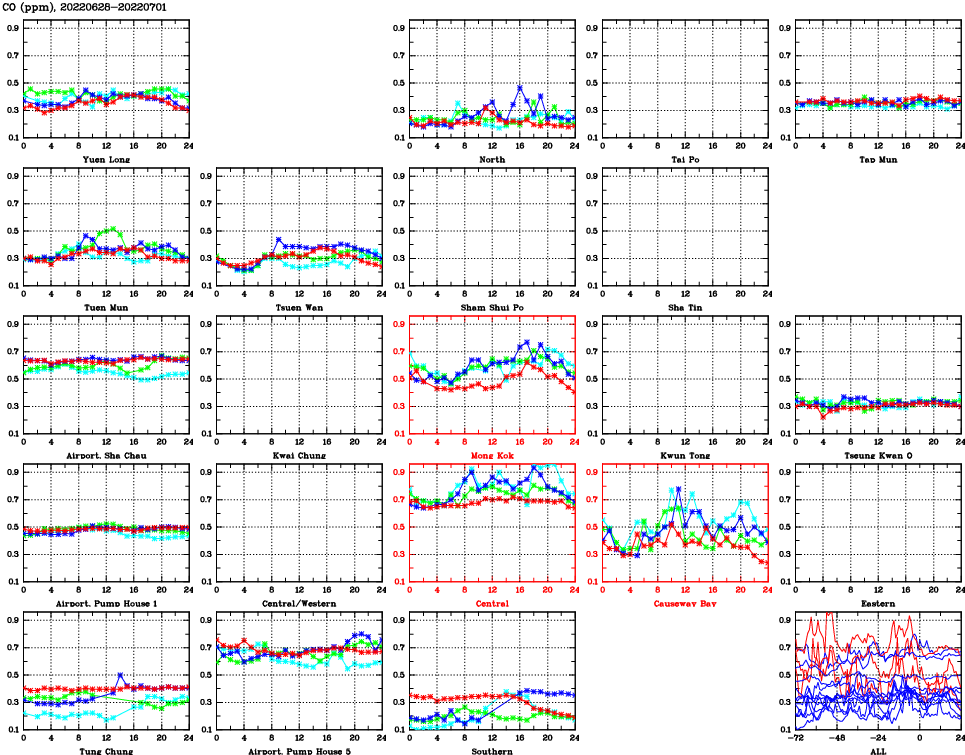 | Air Quality Data Time Series for CO (2022/07/01) | ( Line colors: Day -3 Day -2 Day -1 Current day ) | 2D Map Current AQHI |