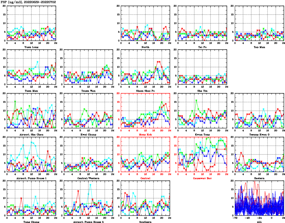 | Air Quality Data Time Series for FSP (2022/07/02) | ( Line colors: Day -3 Day -2 Day -1 Current day ) | 2D Map Current AQHI |
