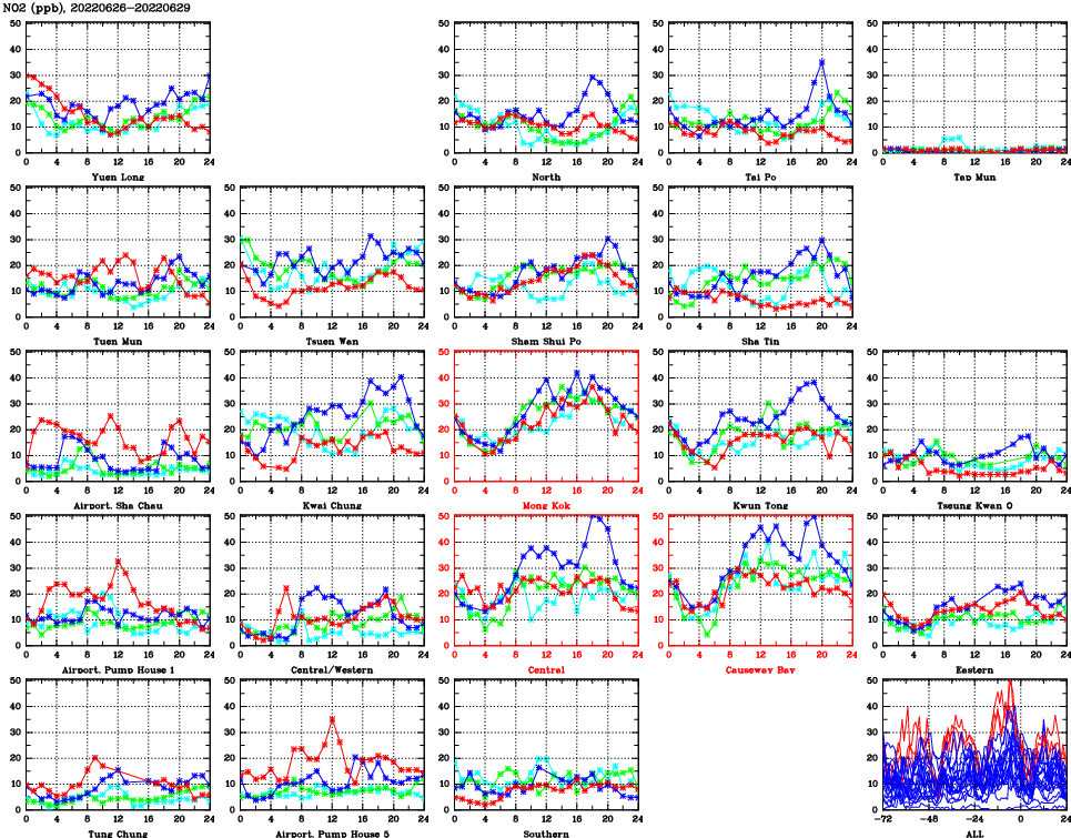 | Air Quality Data Time Series for NO2 (2022/06/29) | ( Line colors: Day -3 Day -2 Day -1 Current day ) | 2D Map Current AQHI |
