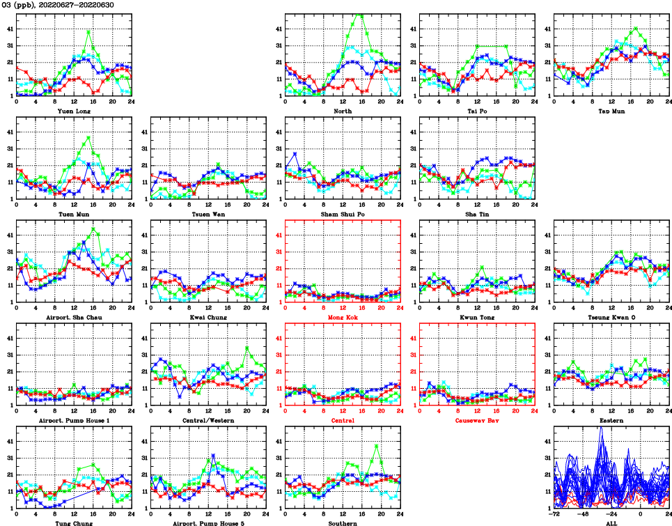 | Air Quality Data Time Series for O3 (2022/06/30) | ( Line colors: Day -3 Day -2 Day -1 Current day ) | 2D Map Current AQHI |
