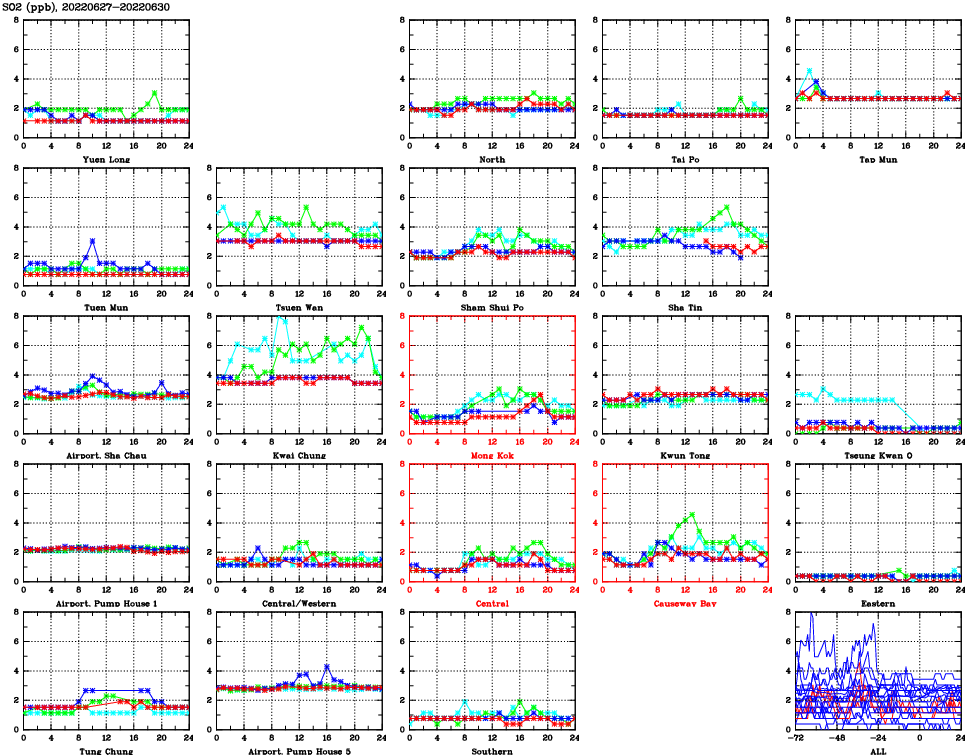 | Air Quality Data Time Series for SO2 (2022/06/30) | ( Line colors: Day -3 Day -2 Day -1 Current day ) | 2D Map Current AQHI |