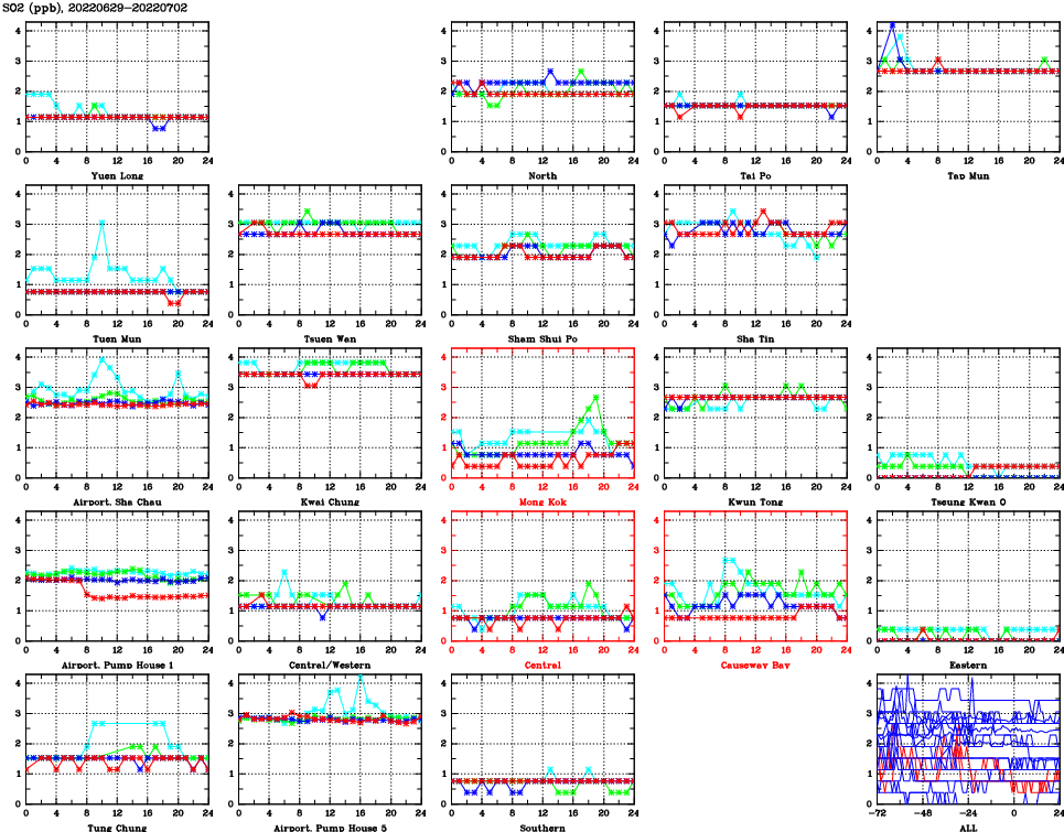 | Air Quality Data Time Series for SO2 (2022/07/02) | ( Line colors: Day -3 Day -2 Day -1 Current day ) | 2D Map Current AQHI |