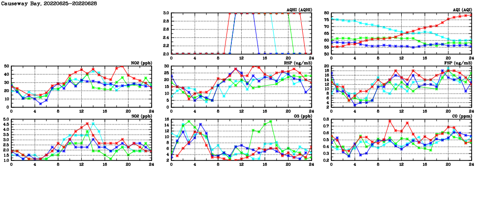 | Air Quality Data Time Series in Causeway Bay (2022/06/28) | ( Line colors: Day -3 Day -2 Day -1 Current day ) | 2D Map Current AQHI |