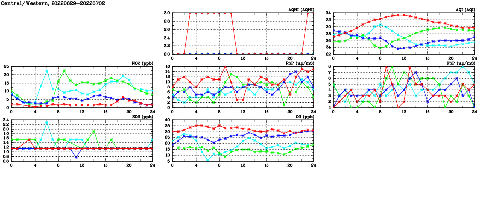 | Air Quality Data Time Series in Central/Western (2022/07/02) | ( Line colors: Day -3 Day -2 Day -1 Current day ) | 2D Map Current AQHI |