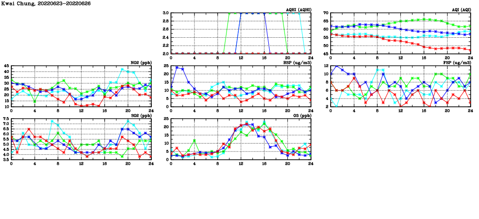 | Air Quality Data Time Series in Kwai Chung (2022/06/26) | ( Line colors: Day -3 Day -2 Day -1 Current day ) | 2D Map Current AQHI |