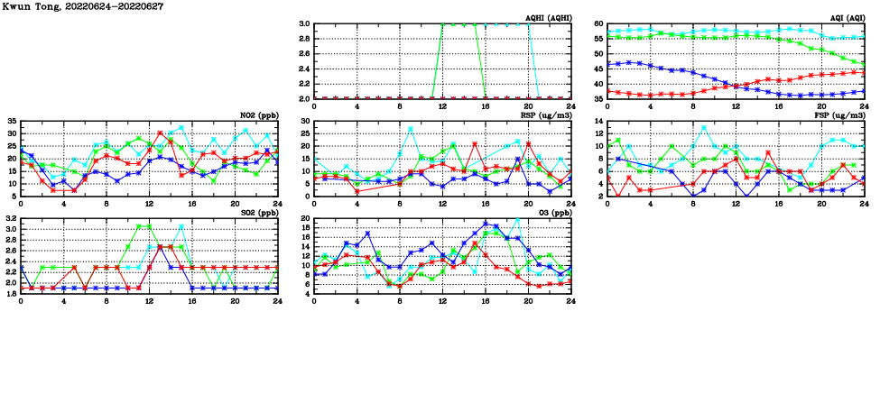 | Air Quality Data Time Series in Kwun Tong (2022/06/27) | ( Line colors: Day -3 Day -2 Day -1 Current day ) | 2D Map Current AQHI |