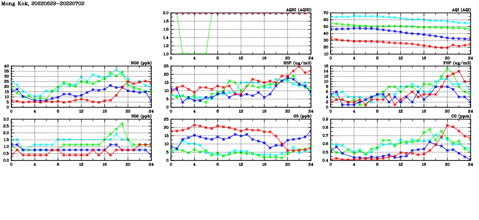 | Air Quality Data Time Series in Mong Kok (2022/07/02) | ( Line colors: Day -3 Day -2 Day -1 Current day ) | 2D Map Current AQHI |