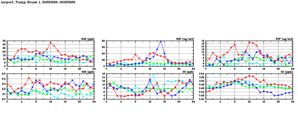 | Air Quality Data Time Series in Airport, Pump House 1 (2022/06/29) | ( Line colors: Day -3 Day -2 Day -1 Current day ) | 2D Map Current AQHI |