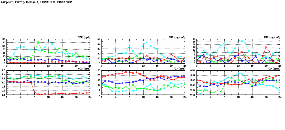 | Air Quality Data Time Series in Airport, Pump House 1 (2022/07/02) | ( Line colors: Day -3 Day -2 Day -1 Current day ) | 2D Map Current AQHI |