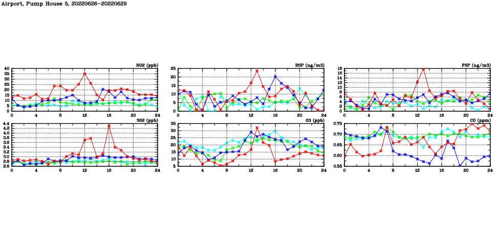 | Air Quality Data Time Series in Airport, Pump House 5 (2022/06/29) | ( Line colors: Day -3 Day -2 Day -1 Current day ) | 2D Map Current AQHI |