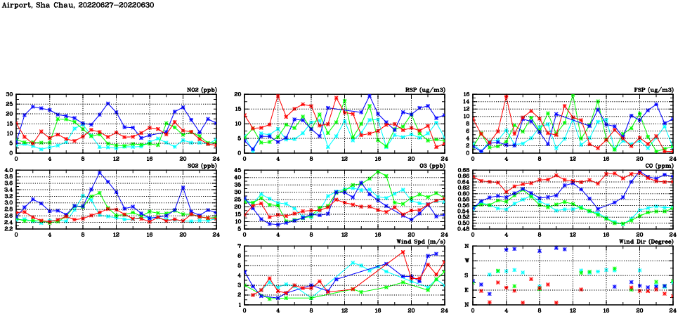 | Air Quality Data Time Series in Airport, Sha Chau (2022/06/30) | ( Line colors: Day -3 Day -2 Day -1 Current day ) | 2D Map Current AQHI |