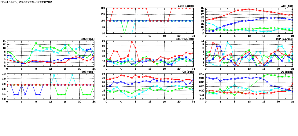 Air Quality Data Time Series in Southern (2022/07/02) | ( Line colors: Day -3 Day -2 Day -1 Current day ) | 2D Map Current AQHI |