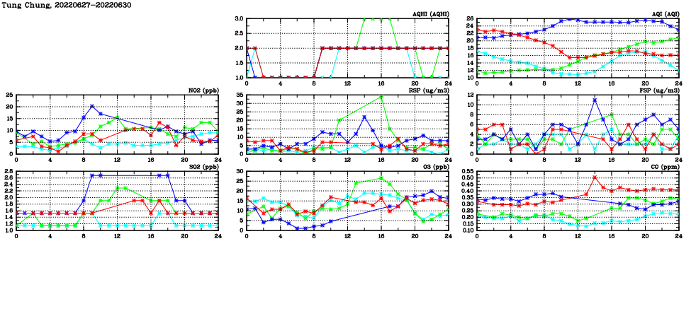 | Air Quality Data Time Series in Tung Chung (2022/06/30) | ( Line colors: Day -3 Day -2 Day -1 Current day ) | 2D Map Current AQHI |