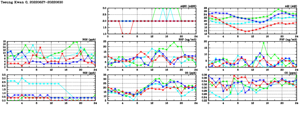 | Air Quality Data Time Series in Tseung Kwan O (2022/06/30) | ( Line colors: Day -3 Day -2 Day -1 Current day ) | 2D Map Current AQHI |