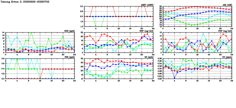 | Air Quality Data Time Series in Tseung Kwan O (2022/07/02) | ( Line colors: Day -3 Day -2 Day -1 Current day ) | 2D Map Current AQHI |