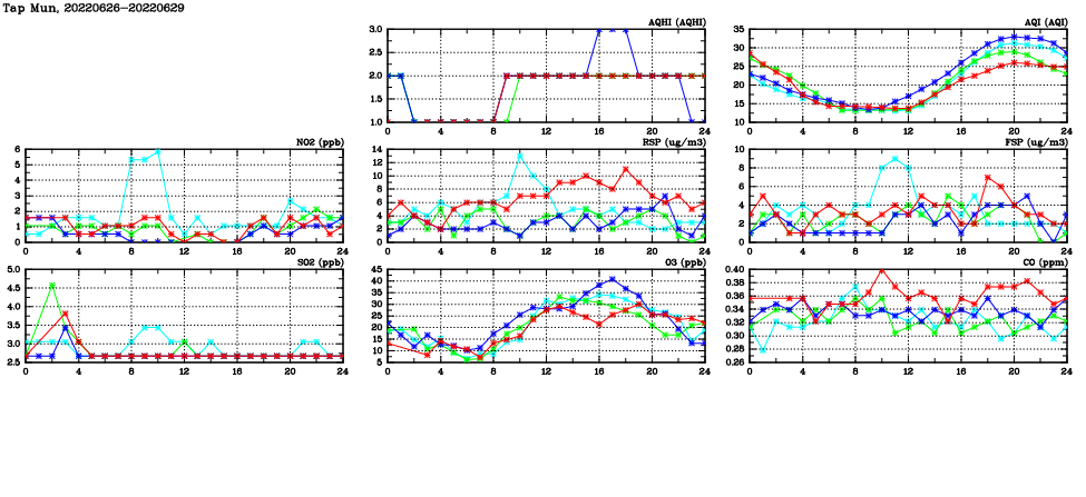 | Air Quality Data Time Series in Tap Mun (2022/06/29) | ( Line colors: Day -3 Day -2 Day -1 Current day ) | 2D Map Current AQHI |