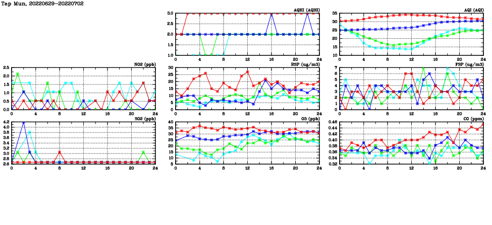 | Air Quality Data Time Series in Tap Mun (2022/07/02) | ( Line colors: Day -3 Day -2 Day -1 Current day ) | 2D Map Current AQHI |