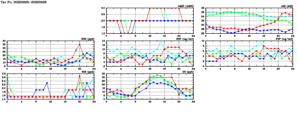 | Air Quality Data Time Series in Tai Po (2022/06/28) | ( Line colors: Day -3 Day -2 Day -1 Current day ) | 2D Map Current AQHI |