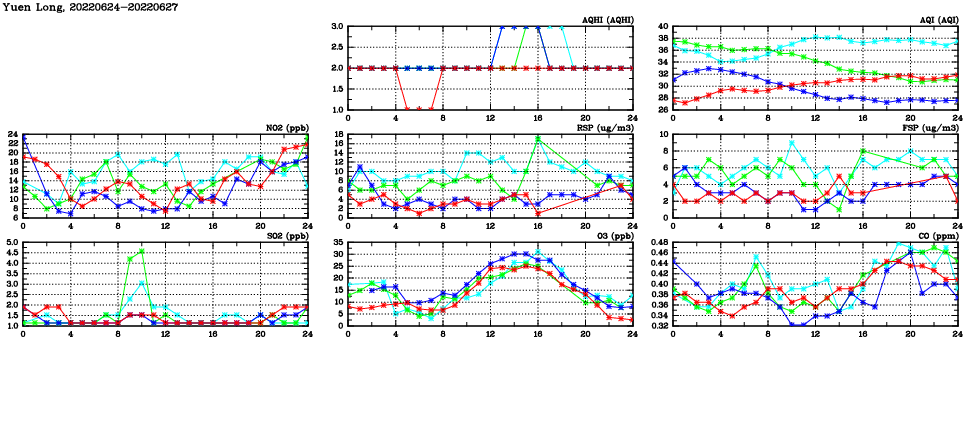 | Air Quality Data Time Series in Yuen Long (2022/06/27) | ( Line colors: Day -3 Day -2 Day -1 Current day ) | 2D Map Current AQHI |