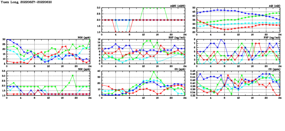 | Air Quality Data Time Series in Yuen Long (2022/06/30) | ( Line colors: Day -3 Day -2 Day -1 Current day ) | 2D Map Current AQHI |